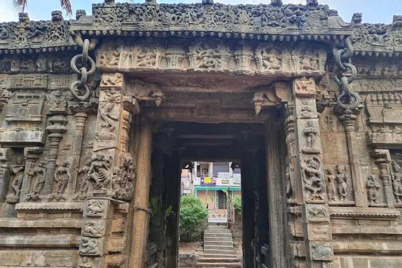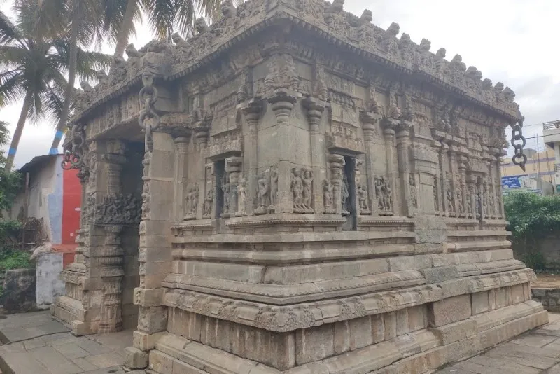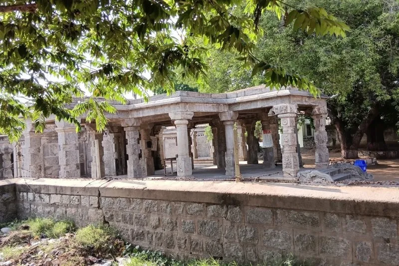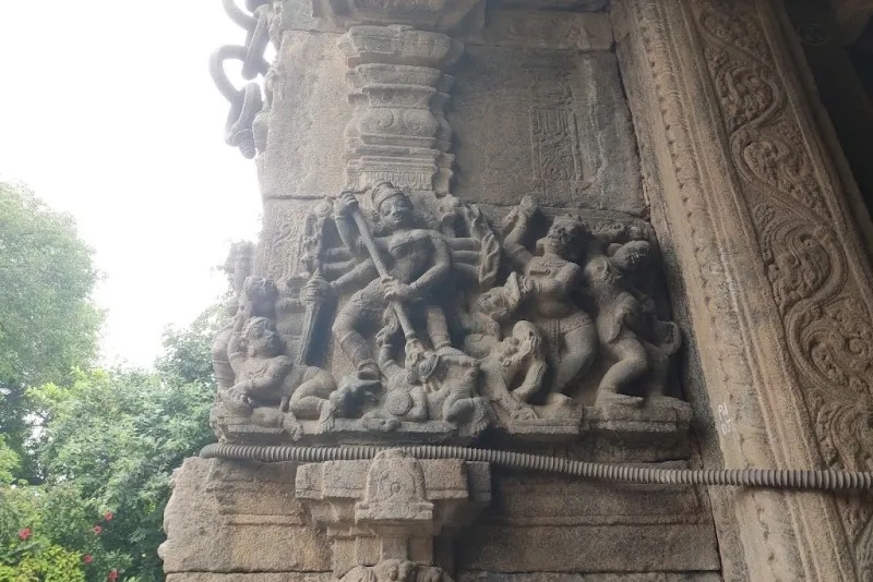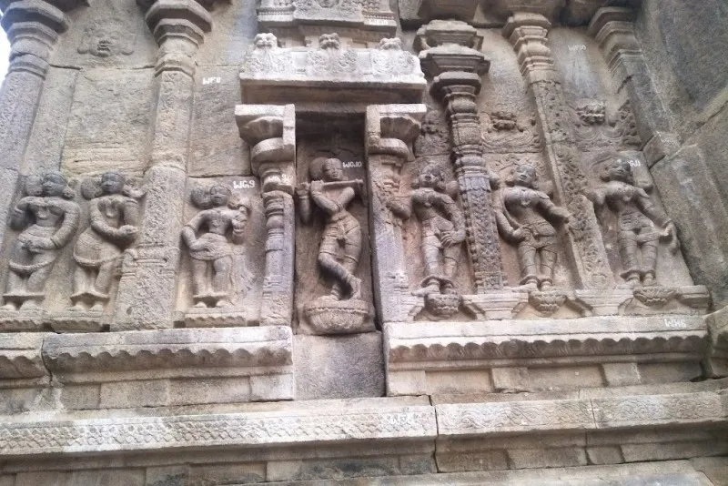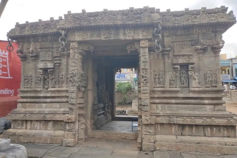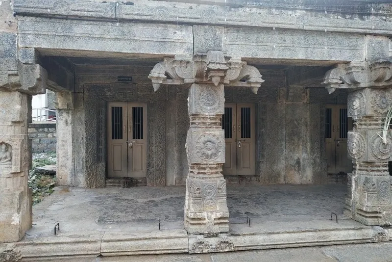 ದೇವಾಲಯದ ಮುಂಭಾಗದ ಸಭಾಂಗಣವು ವಿವಿಧ ಹಿಂದೂ ದೇವತೆಗಳ ಚಿತ್ರಗಳನ್ನು ಹೊಂದಿದೆ. ವಿಷ್ಣು, ಷಣ್ಮುಖ, ಪಾರ್ವತಿ, ಮಹಿಷಾಸುರಮರ್ದಿನಿ, ಭೈರವ, ದುರ್ಗಾ, ವೀರಭದ್ರ ಮತ್ತು ಗಣಪತಿ. ಪ್ರವೇಶದ ಗೋಡೆಗಳನ್ನು ಪೌರಾಣಿಕ ಕಥೆಗಳು ಮತ್ತು ಮಹಾಕಾವ್ಯಗಳ ದೃಶ್ಯಗಳನ್ನು ಚಿತ್ರಿಸುವ ಉಬ್ಬುಶಿಲ್ಪಗಳಿಂದ ಅಲಂಕರಿಸಲಾಗಿದೆ. ಪ್ರವೇಶದ್ವಾರಕ್ಕೆ ಒದಗಿಸಲಾದ ಅಸಾಮಾನ್ಯ ಅಲಂಕಾರವೆಂದರೆ ಕಲ್ಲಿನ ಉಂಗುರಗಳ ಸರಪಳಿಗಳು.