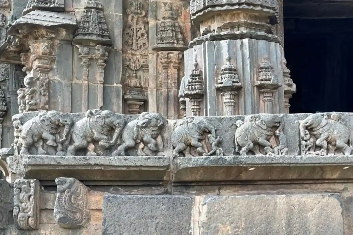ದೇವಾಲಯದ ಮುಖಮಂಟಪವು ಮೇಲ್ಛಾವಣಿಯನ್ನು ಬೆಂಬಲಿಸುವ ಸಂಕೀರ್ಣವಾದ ಕೆತ್ತನೆಗಳೊಂದಿಗೆ ಉತ್ತಮವಾಗಿ ರಚಿಸಲಾದ ಅರ್ಧ ಕಂಬಗಳನ್ನು ಹೊಂದಿದೆ. ದೇವಾಲಯಗಳ ಗೋಡೆಗಳು ಮಧ್ಯಂತರದಲ್ಲಿ ಗೋಪುರಗಳನ್ನು ಹೊಂದಿದ್ದು ಒಟ್ಟಾರೆ ಅಲಂಕಾರವನ್ನು ಆಕರ್ಷಕವಾಗಿಸುತ್ತದೆ. ನೆಲಮಾಳಿಗೆಯಲ್ಲಿನ ಅಲಂಕರಣ ಮತ್ತು ಗೋಡೆಗಳ ಮೇಲಿನ ಕೆತ್ತನೆ ಕೆಲಸಗಳು ವಾಸ್ತುಶೈಲಿಯನ್ನು ಅನನ್ಯವಾಗಿ ಬೆರಗುಗೊಳಿಸುವ ಸಂಯೋಜನೆಯಾಗಿದೆ.