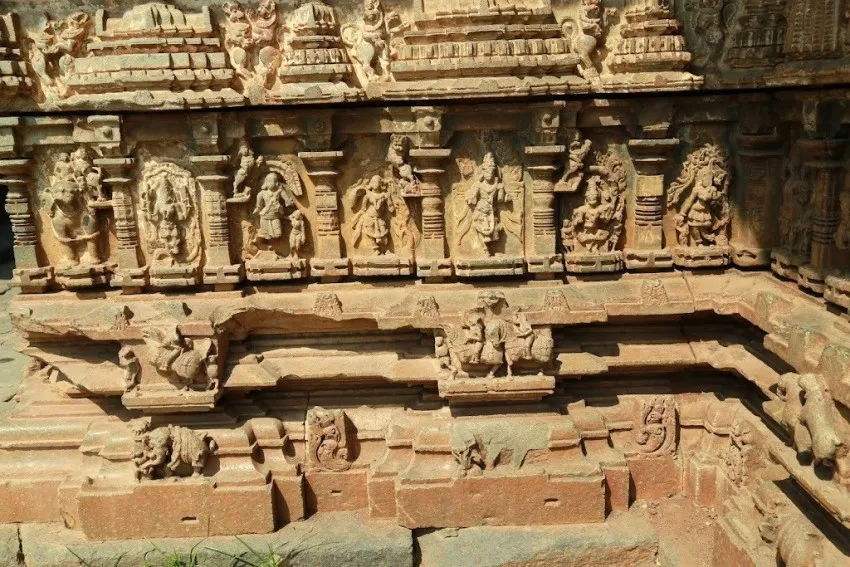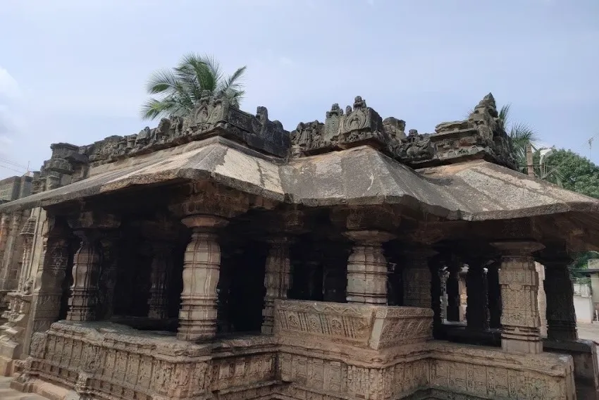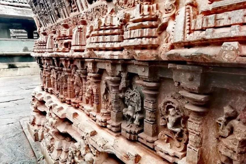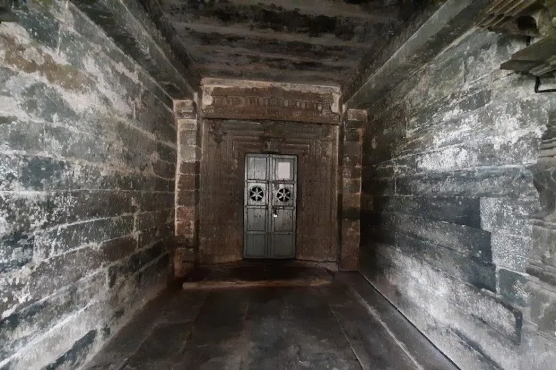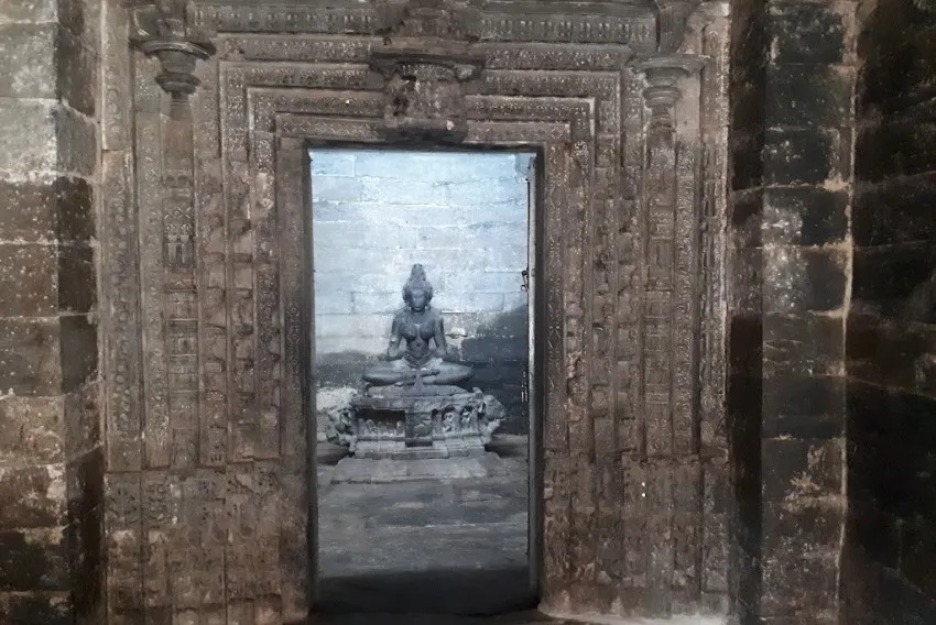 ಬಾಲ್ಕನಿ ರೂಪದಂತೆ ಕಾರ್ಯನಿರ್ವಹಿಸುವ ಇಳಿಜಾರಾದ ಚಪ್ಪಡಿಗಳನ್ನು ಸಾಂಕೇತಿಕ ಫಲಕಗಳಿಂದ ಅಲಂಕರಿಸಲಾಗಿದೆ ಮತ್ತು ಕಡಿದಾದ ಕೋನೀಯ ಚಾಚುಪಟ್ಟಿಗಳಿಂದ ಮೇಲೆ ಜೋಡಿಸಲಾಗಿದೆ. ಸಭಾಂಗಣದ ಒಳಗೆ, ಸ್ತಂಭಗಳು ಆಳವಿಲ್ಲದ ಗೂಡುಗಳಲ್ಲಿ ಜೋಡಿಸಲಾದ ಚಿತ್ರಗಳನ್ನು ಹೊಂದಿವೆ. ಪೂರ್ವ ಗರ್ಭಗುಡಿಯಲ್ಲಿ ಬ್ರಹ್ಮ, ಮಹೇಶ್ವರ ಮತ್ತು ವಿಷ್ಣುವನ್ನು ಪ್ರತಿನಿಧಿಸುವ ಮೂರು ಲಿಂಗಗಳಿವೆ ಮತ್ತು ದಕ್ಷಿಣದ ಒಂದು ಸರಸ್ವತಿ ದೇವಿಗೆ ಸಮರ್ಪಿತವಾಗಿದೆ.